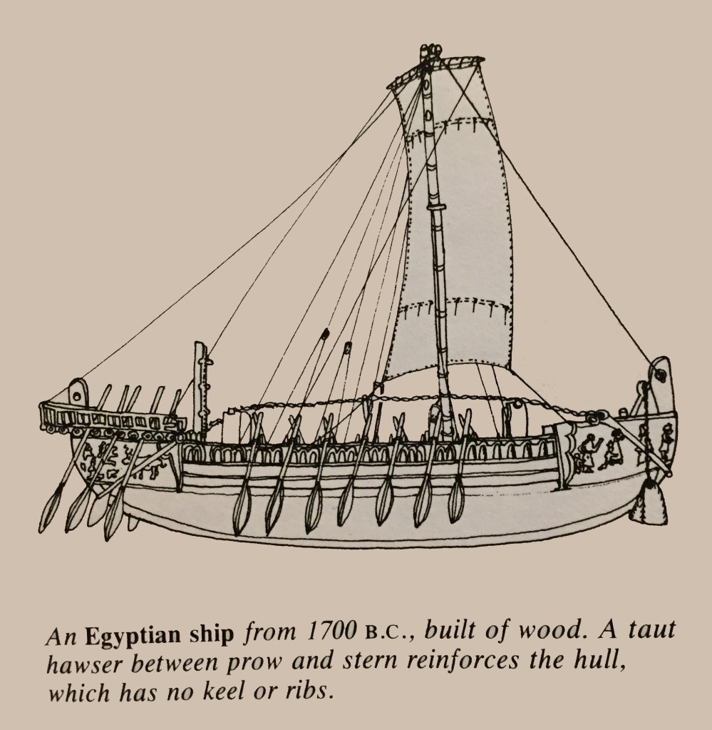 More accurate documentation of Egyptian boats comes from the models found in Mektire’s tomb who was buried in the early 2nd millennium BCE. Some of the models lack the hawser cable and instead have a beam running from stem to stern with pairs of frames branching off and movable planks between them. Perhaps the first example of dunnage. The two steering paddles have been replaced with a single paddle over the stern. The mast is also no longer a bipod and has stays and shrouds.