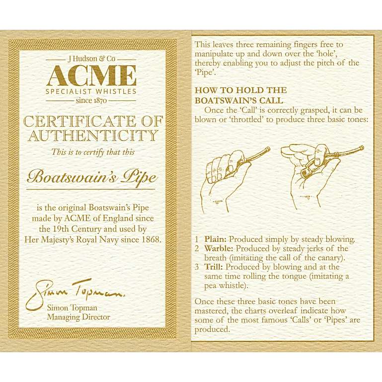 Using the pipe is fairly simple, but like any instrument, it does require practice. At sea, you’ll sometimes see prospective BMs practicing their calls in their free time. Since I am in no way qualified to teach you how to play it, the following images will have to suffice.