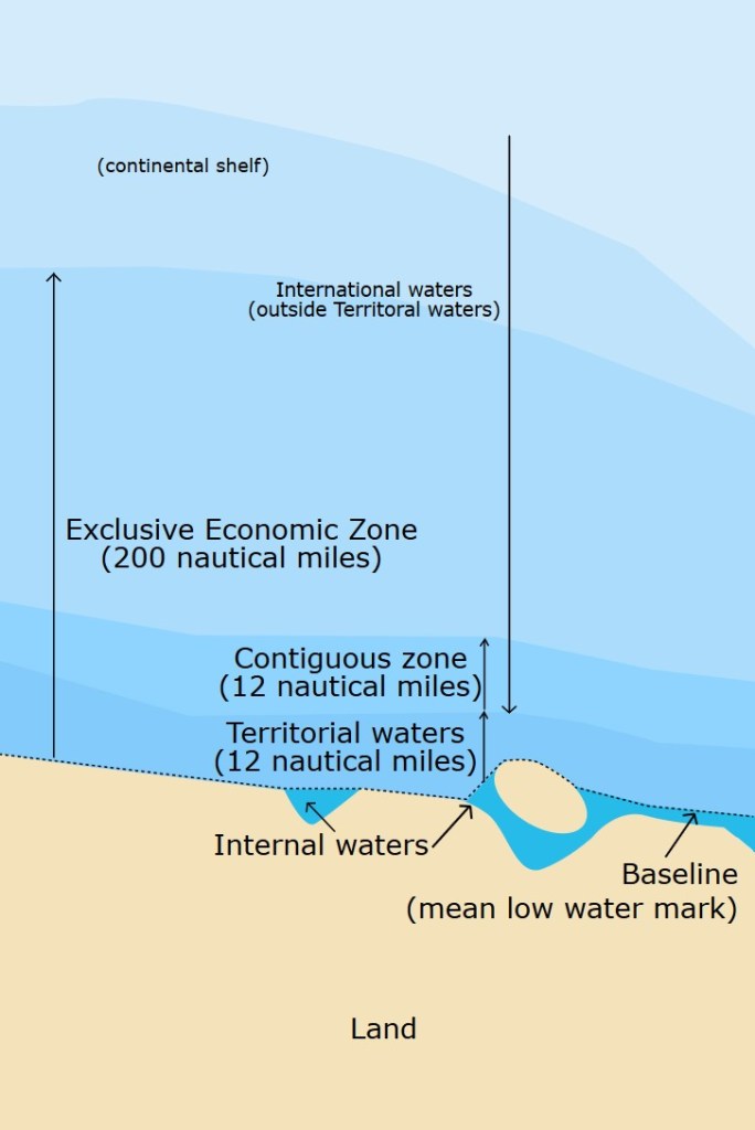 In 1982 there was an attempt to codify the laws and governance of the seas. The result was the United Nations Convention on the Law of the Sea (UNCLOS). One result was the larger enclosure of the oceans. According to UNCLOS, a country’s territorial waters are defined at 12 miles from shore, the contiguous zone is a further 12 miles beyond that, and an Exclusive Economic Zone (EEZ) extends 200 miles from the shore where a country has the rights to explore and exploit the natural resources. Vessels have the right of “innocent passage” when transiting through another country’s territorial waters with some limitations. However, the sea beyond the 12-mile territorial waters is considered international waters and vessels can transit them unconstrained.
