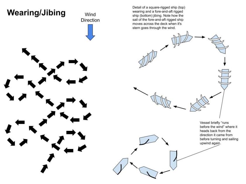 In the above illustration, the ship is on a port tack. By wearing/jibing ship, the vessel turns to starboard and moves the stern through the direction of the wind before circling around with the wind now on the starboard tack. The next time it wears/jibes, the vessel will turn to port and complete the same maneuver to come around on a port tack again.