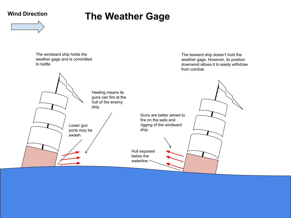 The weather gage refers to how two ships are positioned relative to each other in relation to the direction of the wind. The biggest application of this tactic came during the age of sail when battles were often decided by how well vessels could use the wind to the best of their advantage. To have (or hold) the weather gage is to be positioned to the windward side of another vessel. As with any naval tactic, there are advantages and disadvantages to holding the weather gage.