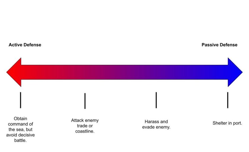 Geoffrey Till (2013) puts the fleet-in-being strategy on a spectrum with a moderated offensive on one end and a passive defense on the other. The environments range from littoral waters to the high seas, and for both short and long time periods. In their various forms, an inferior fleet’s operations can aim to: