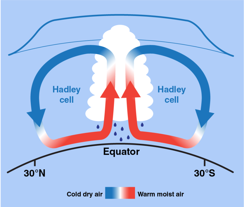 The trade winds are the result of a cycle of warm, moist air being heated by the sun and rising near the equator. As the air rises, it becomes cooler and denser to the north and south of the equator where it descends back towards the surface. This cool air then rushes in to fill the area vacated by the rising, warm air and completes the cycle. This process creates what’s known as a Hadley cell (as seen in the above diagram). Note that the warm, wet air rises to form clouds and frequent thunderstorms around the equator.4
