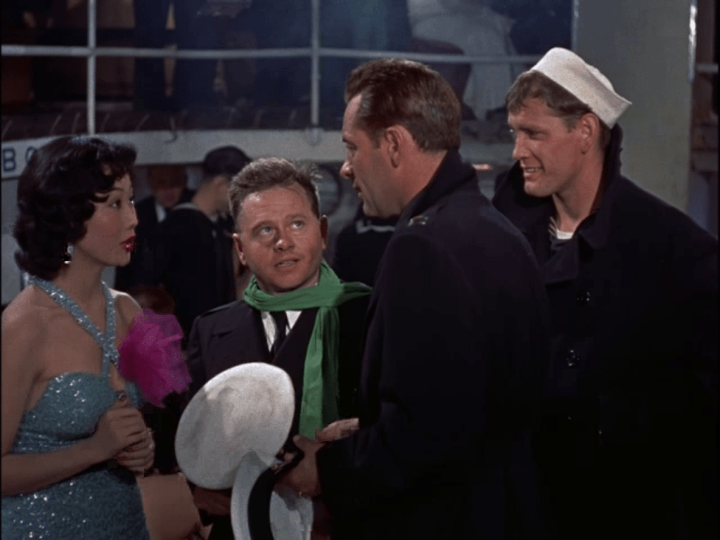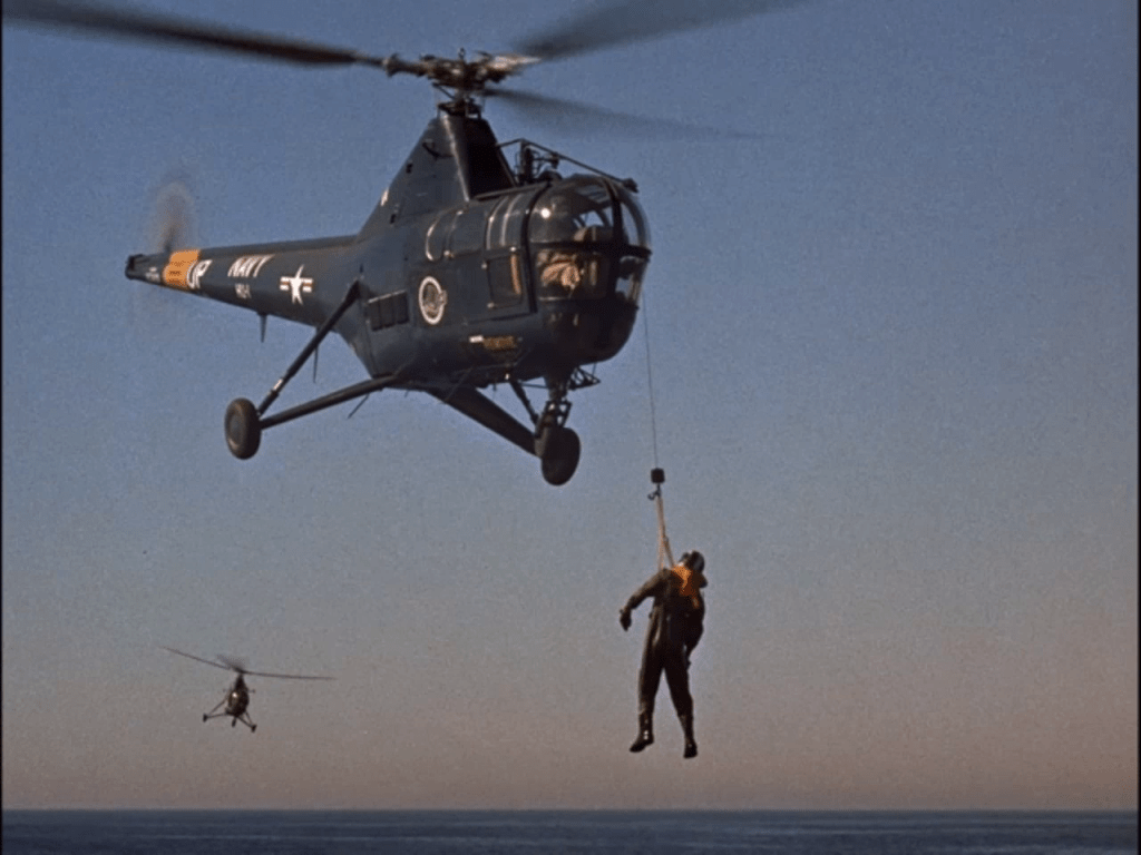 While returning to the carrier, Brubaker is forced to ditch his F9F Panther in the freezing Sea of Japan but is rescued by Chief Petty Officer (Naval Aviation Pilot, NAP) Mike Forney (Mickey Rooney) and Naval Air Crewman (NAC) Nestor Gamidge (Earl Holliman) flying a rescue helicopter. Despite his effectiveness and fun-loving, irreverent attitude, Forney has upset his superiors several times before for wearing a non-regulation green top hat and scarf while flying. While debriefing with Tarrant, Brubaker voices his frustration at the fact that he was recalled to fight in Korea while other organized units were left back in the States drawing pay and that most Americans seem to be ignorant of the conflict. Tarrant laments that “every war’s the wrong one,” and that a handful of volunteers will be required to make sacrifices for many. He further appraises Brubaker about an upcoming strike on the heavily defended bridges at Toko-Ri and gently chastises Brubaker for somehow getting his wife and two daughters to meet him in Yokosuka, Japan on their next port visit, despite Navy regulations.