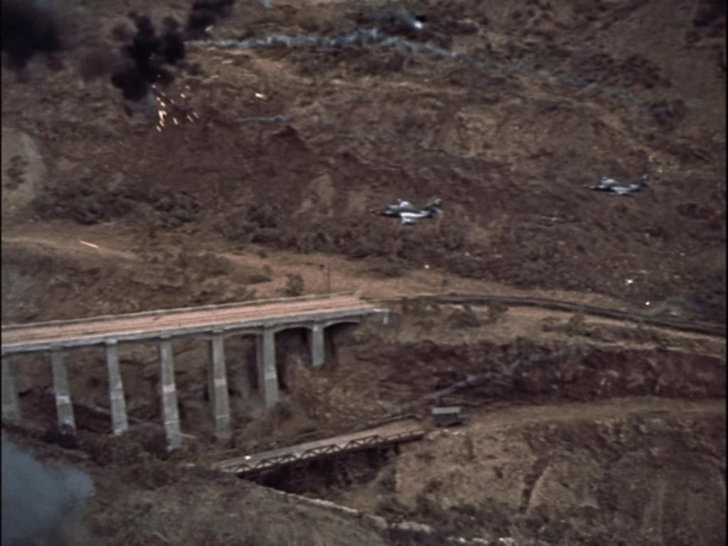 Somewhat unusually for a Hollywood production, the film follows the book extremely closely (if only the same could be said for more films based on actual historical events). Many of the dialogue scenes are taken almost word-for-word from the book. A handful of scenes are switched around or changed from the book, but apart from that, this is basically a very close rendition of Michener’s novella. As closely as the film follows the book, it’s important to remember that the story itself is historical fiction. There is no actual place in (North or South) Korea called Toko-Ri. However, research indicates that Michener likely drew inspiration from multiple events and personalities, particularly, two missions to bomb bridges at two different places. One is known as Majon-ni [Sp?], west of Wonsan, and the other is known as Samdong-ni, near the villages of Toko-san and Poko-ri (Michener reportedly combined the names to create the title).1 In the film, as Brubaker and CAG fly their photo recon mission, they mention passing over checkpoints at the towns of Majon-ni and Yangdŏk, with the bridges being 15 miles ahead. These are real towns in North Korea, west of Wonsan. Exactly how much of the book is based on these strike missions is debatable, but I plan to do a write-up on the various sources of inspiration for the bridges at Toko-Ri. Interestingly, unlike the book which gives no date, the film specifically places the events in November 1952.