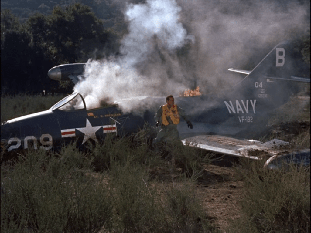 The squadron Brubaker is flying with is a real squadron (although it’s not named in the book). Fighting Squadron VF-192 “Golden Dragons” was aboard Oriskany during filming. The unit patch can be seen on the characters’ flight jackets and a golden dragon is painted on the nose of the aircraft. Following the release of the film, they renamed themselves the “World Famous Golden Dragons.” VF-192 did two deployments to Korea but they were aboard USS Princeton (CV-37) flying Vought F4U-4 Corsairs. They didn’t receive their F9F-2 Panthers until early 1953, and filming took place in September of that year.