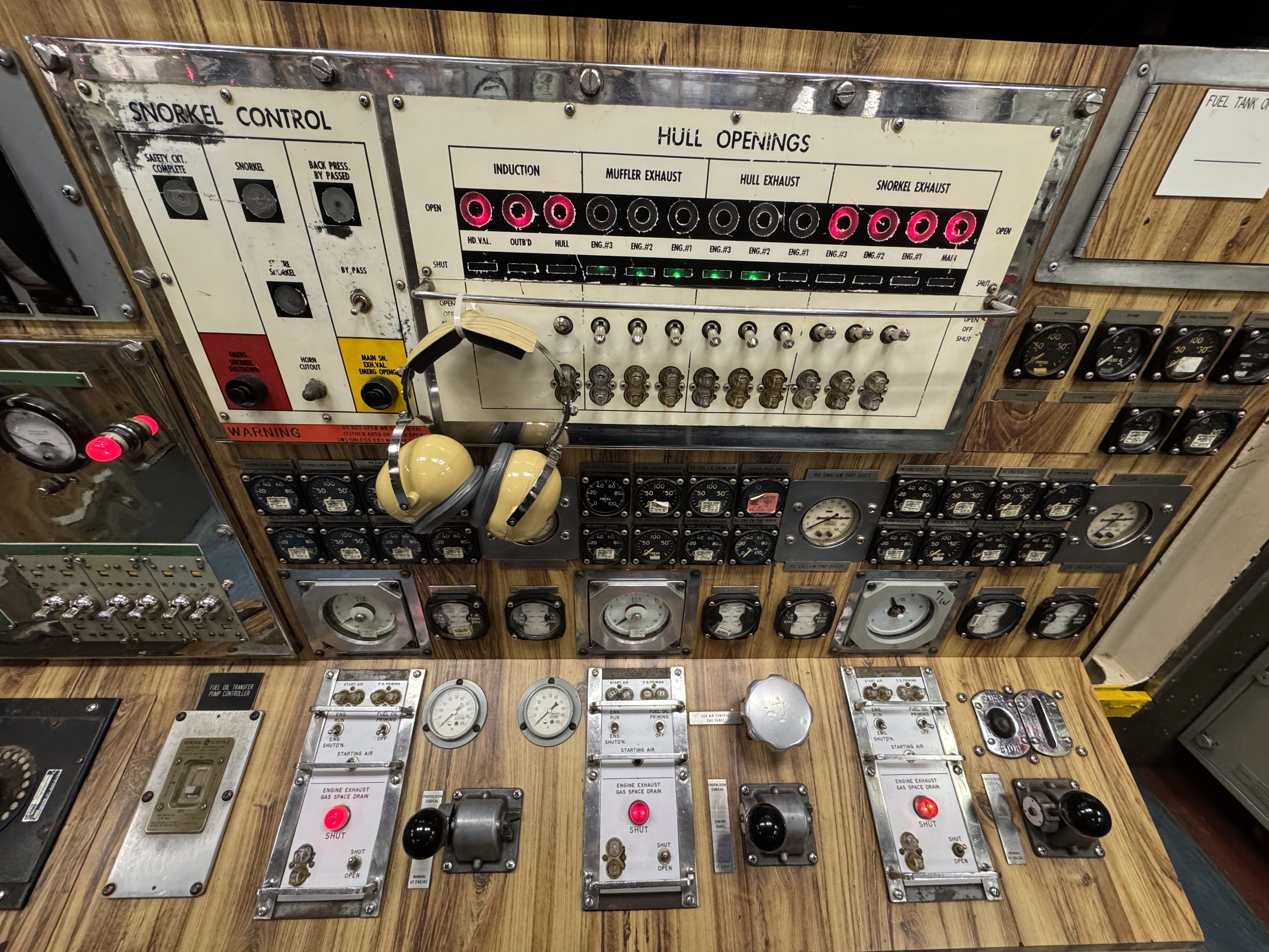 Visitors to Blueback will note that the engine room is rather noisy. That sound is actually a recording. In real life, if those engines were running, then they would purr at 137 dB, and the room would reach 120 – 130 degrees F. If you were to enter the engine room without hearing protection, you would have permanent hearing damage in 30 minutes. So you’d have to wear double the hearing protection. That means rubber earplugs and “Mickey Mouse” earmuffs.