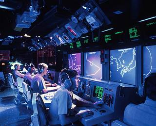 According to Timothy Mauch, a former Chief Sonar Technician on submarines in the U.S. Navy, the reason for the introduction of blue lighting is that CRT (Cathode Ray Tube) screens, with a long-lasting phosphor, were predominantly amber or green in color. Therefore, white lighting created an enormous amount of reflection and glare and made the screens impossible to see. These were used from the 1950s onward. The screens for the combat systems (such as radar, sonar, ESM, ECM, etc.) would need dim lighting, such as blue or red lights to see clearly (otherwise they would have a curtain that could be pulled around the space to block out white light.4