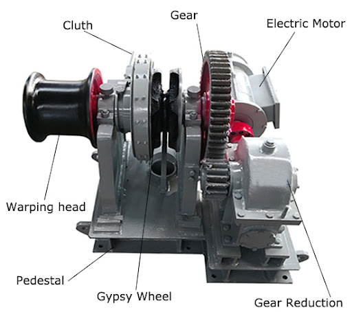The gypsy wheel has teeth (called whelps) that engage the anchor cable chain. The gypsy can be declutched from the shaft to allow it to run freely when letting go of the anchor.