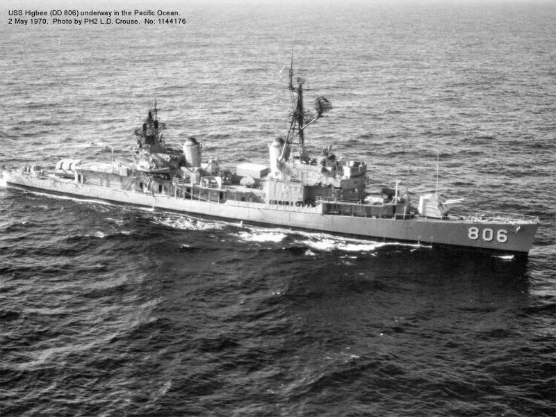 Oh, yeah, yeah, yeah. The USS Higbee. We were at General Quarters. They were probably three-quarters to a mile away from us, off to the left. And we were both going in the same direction. And we were at General Quarters, but that didn’t necessarily mean I couldn’t go up and have a smoke. And so I was up having a smoke and I looked up, and saw this bright flash come out of the sky. And it was a MiG and it, I can’t remember if it really dropped bombs or if it fired something at the Higbee, but it, whatever it was, it blew their after gun mount off. I mean, really, right off. And come to find out later, luckily there had been a fire in the magazine and they had flooded it.3 And so there was no explosion, but they did have to replace the gun mount. Well then, after that MiG circled around, I thought, ‘well, it’s going to come and get us,’ you know. But before it could, I saw this streak of light come through the sky, and it was an anti-aircraft missile. I can’t remember what type it was. Came from the USS Chicago from 65 miles away.4 That’s what I heard later. So blew that thing into smithereens.