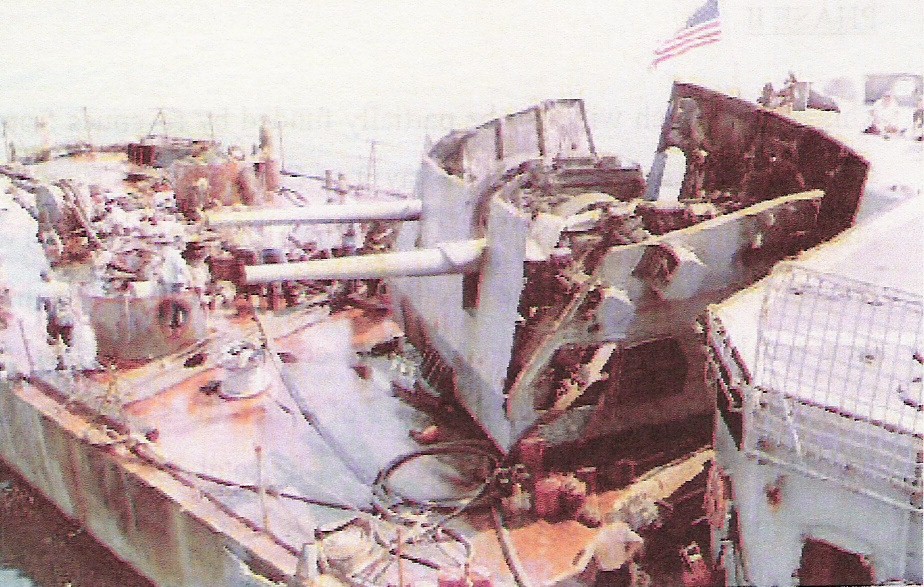Of all the ships that were over there, there was about 30 that were Gearing-class destroyers. We were the only ones that didn’t take a direct hit. We did have one that went through the ensign, but that was as close as they came. We had shrapnel all over the place.
