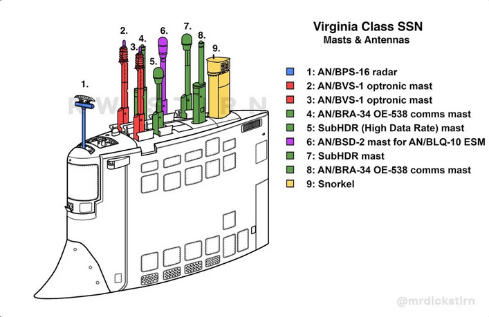 As many articles have also noted, Virginia-class submarines use photonics (AKA optronics) masts rather than traditional optical periscopes. This decreases the need for the periscope wells to penetrate the hull of the submarine, and the information from the photonics masts can be fiber-optically wired to digital screens in the control room, which is also situated lower inside the hull of the boat.